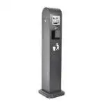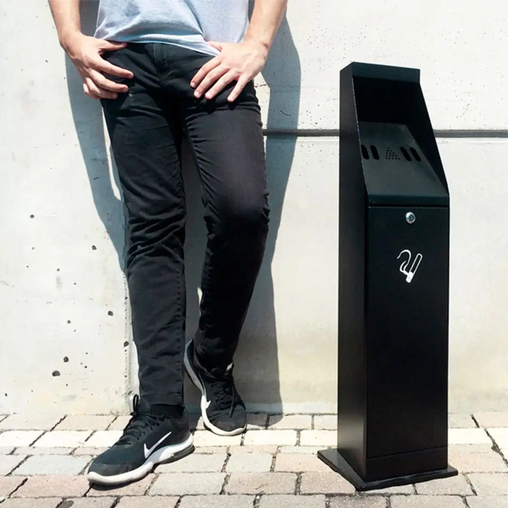 Column ashtray with front opening and upper cover against the rain for extinguishing cigarettes.