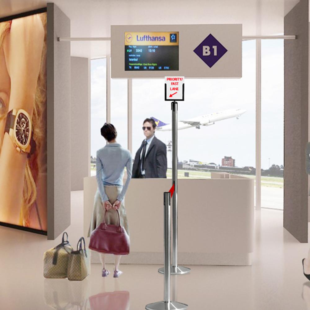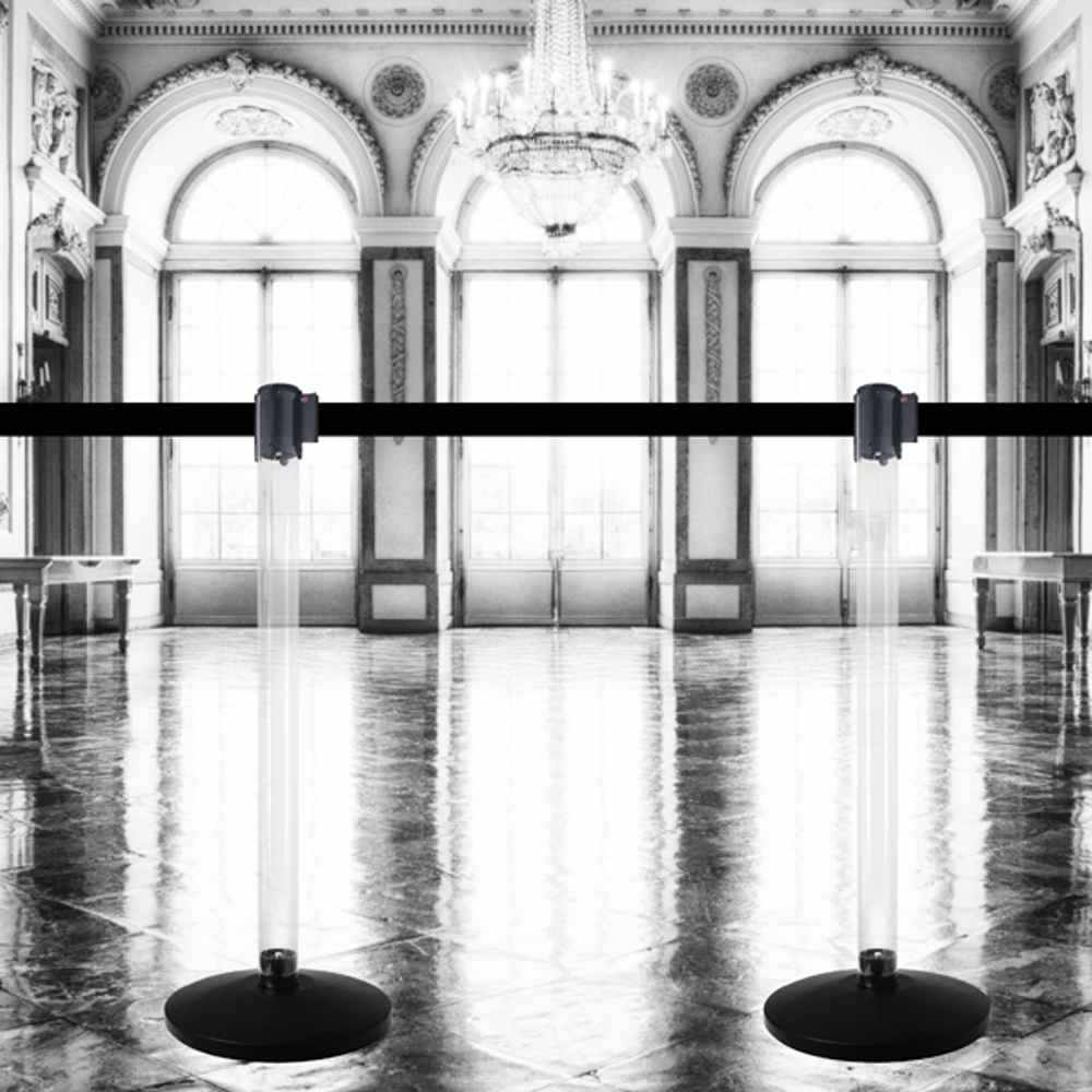 Colonnina segnapercorso tendinastro con montante in PVC trasparente e nastro disponibile in 9 colorazioni.