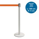 Colonnina in metallo verniciato bianco, base piatta e nastro avvolgibile color arancione.