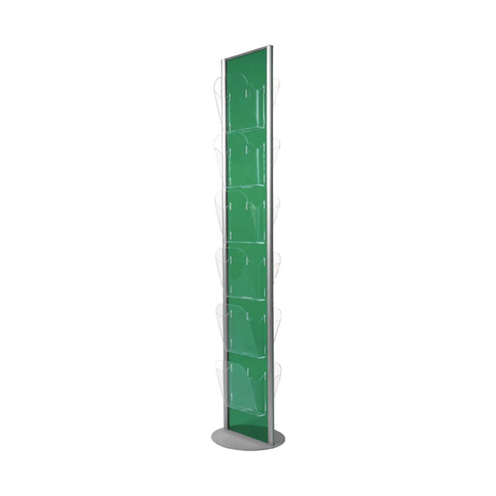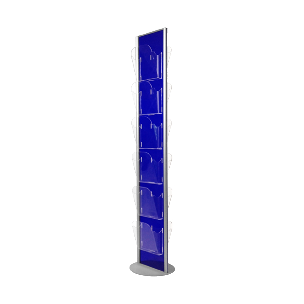 Espositore da pavimento colorato con 12 tasche in plexy trasparente formato A4 con divisorio removibile. Disponibile in 8 diverse colorazioni.