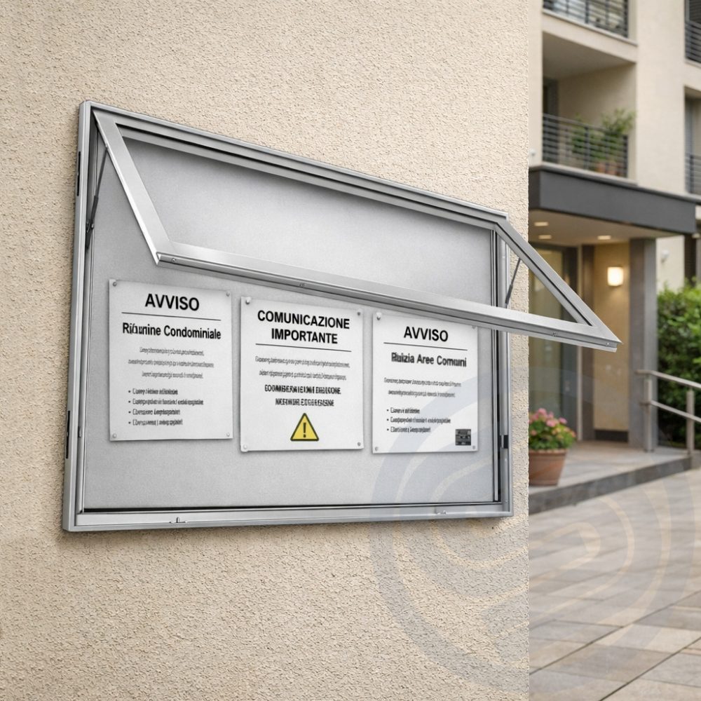 Les profilés en aluminium extrudé assurent l’étanchéité, en protégeant le contenu des agents atmosphériques tels que la pluie et la poussière. Les coins arrondis, conformes aux normes en vigueur, garantissent non seulement une esthétique raffinée, mais aussi une sécurité accrue dans l’utilisation quotidienne. Le fond est en tôle magnétique, ce qui permet d’afficher facilement des documents et des avis à l’aide d’aimants.