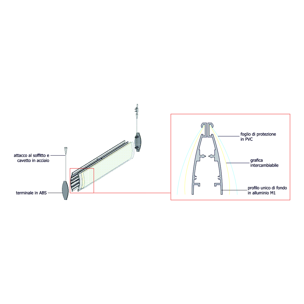 Les embouts en ABS argenté garantissent une fixation sûre et durable. En outre, les câbles en acier, associés à la fixation au plafond, offrent une suspension solide et fiable, ce qui permet d’installer le panneau dans n’importe quelle zone du bâtiment, qu’il s’agisse d’espaces commerciaux ou d’entreprises.