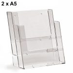 Porta depliant da parete in acrilico trasparente a 2 tasche formato A5.