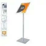 Présentoir à brochures au sol avec base carrée, montant en aluminium et 1 pochette pour catalogues A4.