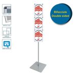 Le présentoir 3xA4 est une structure sur pied qui fait partie de la gamme QUADRA SERIES. Entièrement réalisé en aluminium, il est composé d’un cadre à clipser pour impressions A4, d’un montant à section carrée (d’où la série tire son nom) et d’une base en métal thermolaqué argenté.