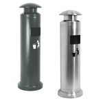 Cestino con apertura frontale per gettare rifiuti e copertura superiore contro la pioggia per lo spegnimento delle sigarette. Disponibile nella colorazione silver o grigio gotico.