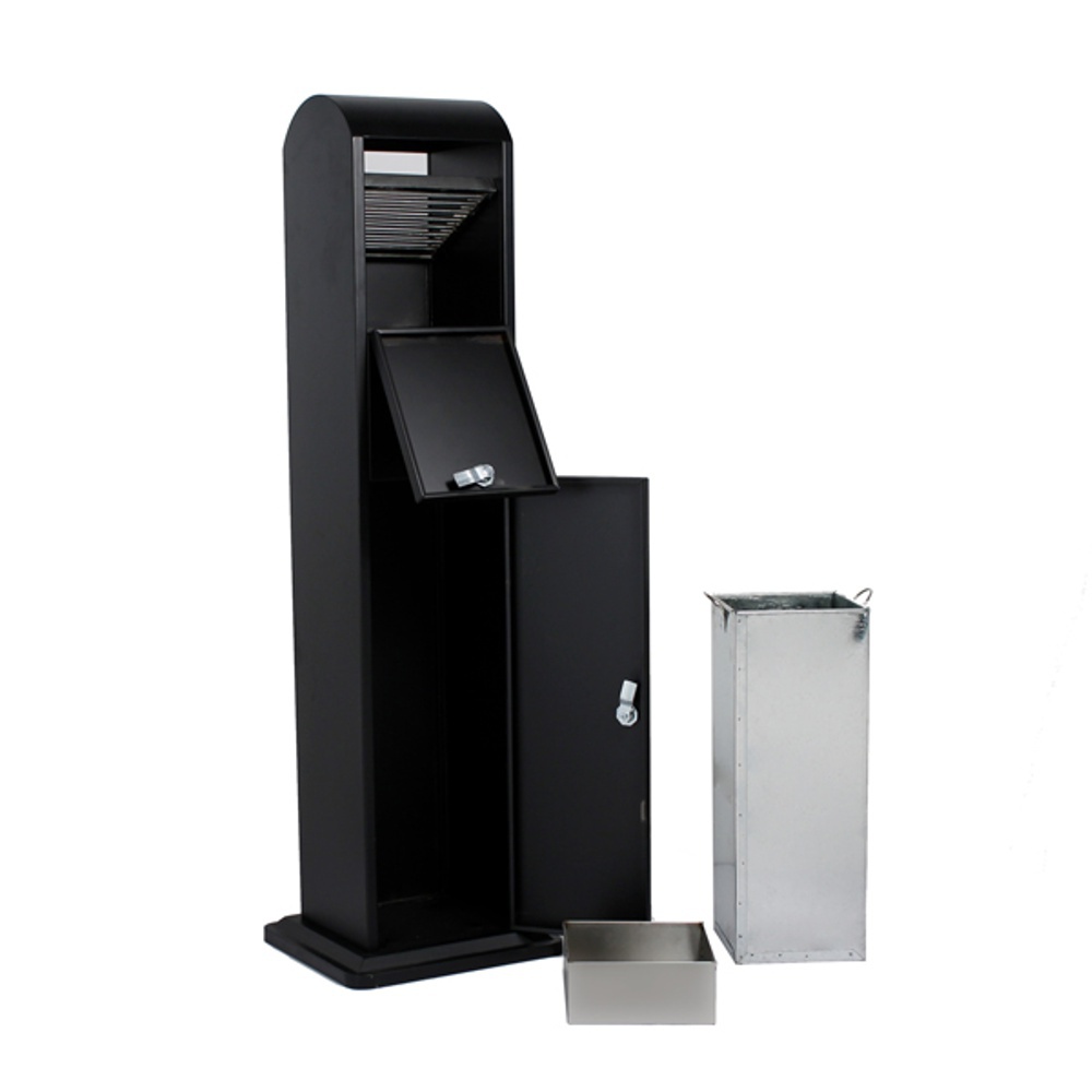 Cestino con apertura frontale per gettare rifiuti e copertura superiore contro la pioggia per lo spegnimento delle sigarette. Disponibile nella colorazione silver o nera.
