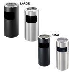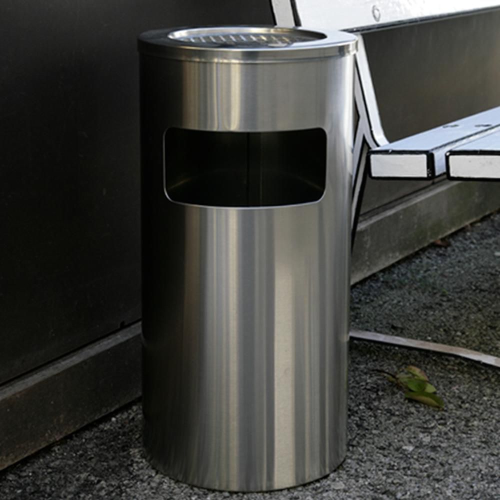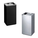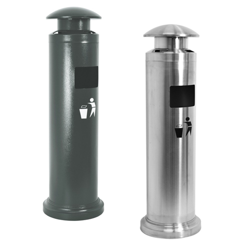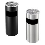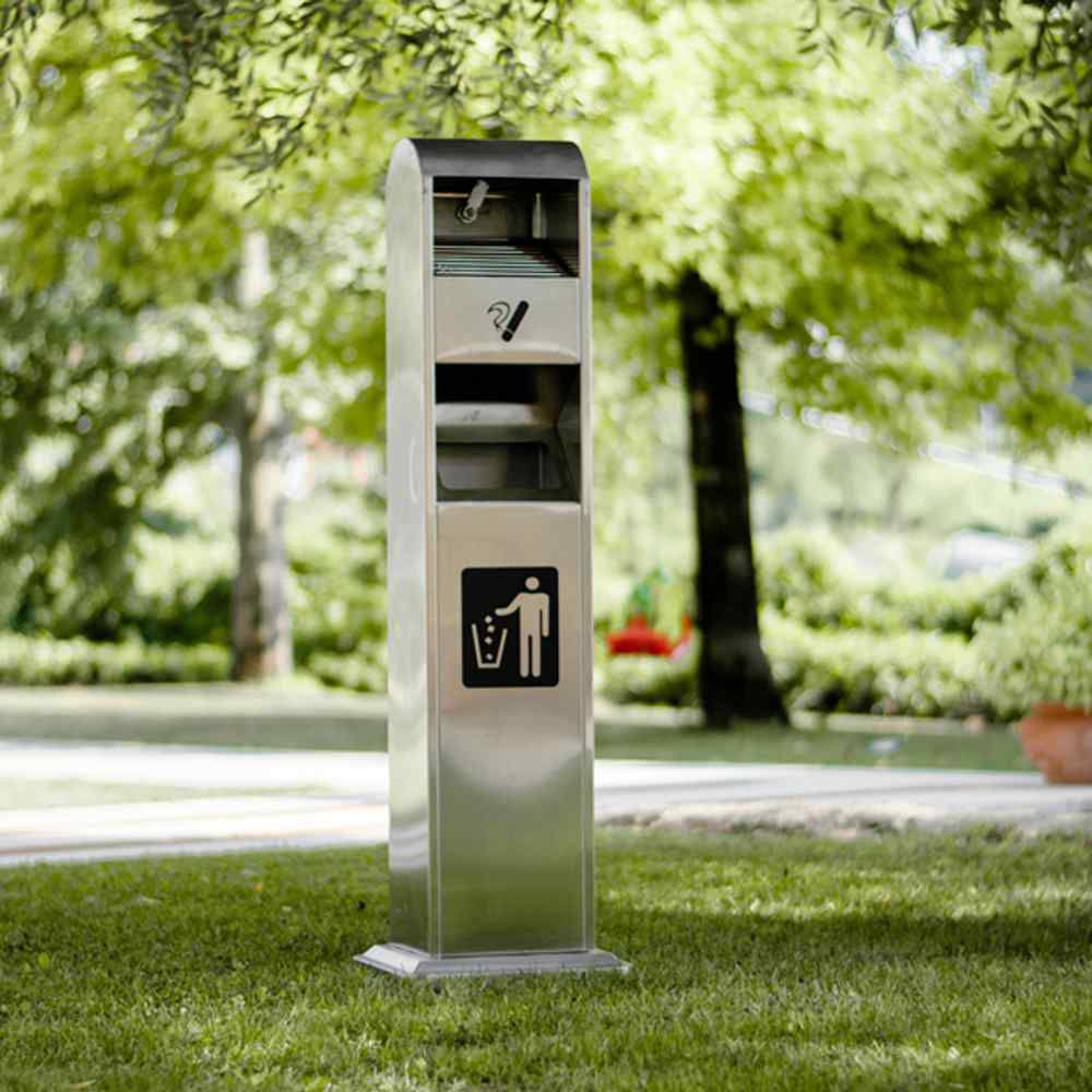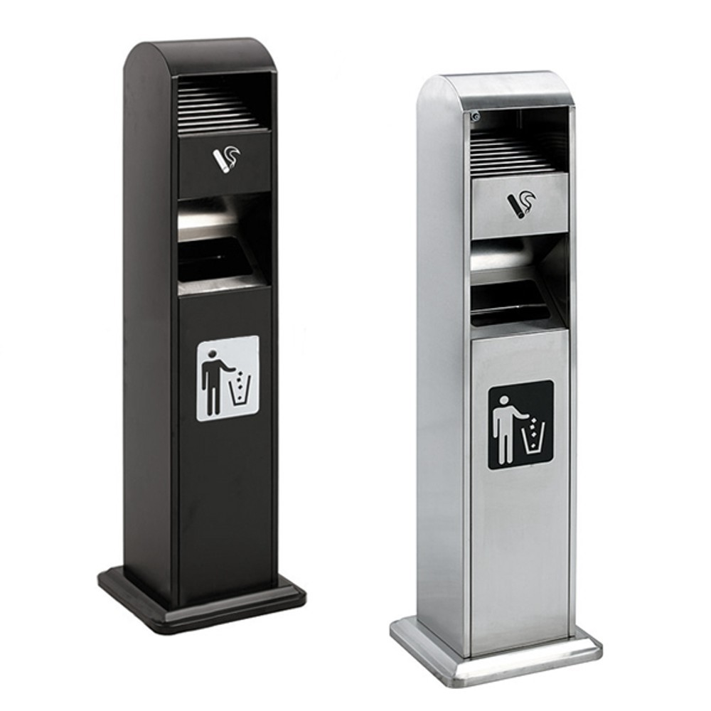 Cestino con apertura frontale per gettare rifiuti e coperchio superiore con griglia a raggi spegni-sigaretta e vaschetta raccogli ceneri facile da svuotare. Disponibile nella colorazione silver o nera.