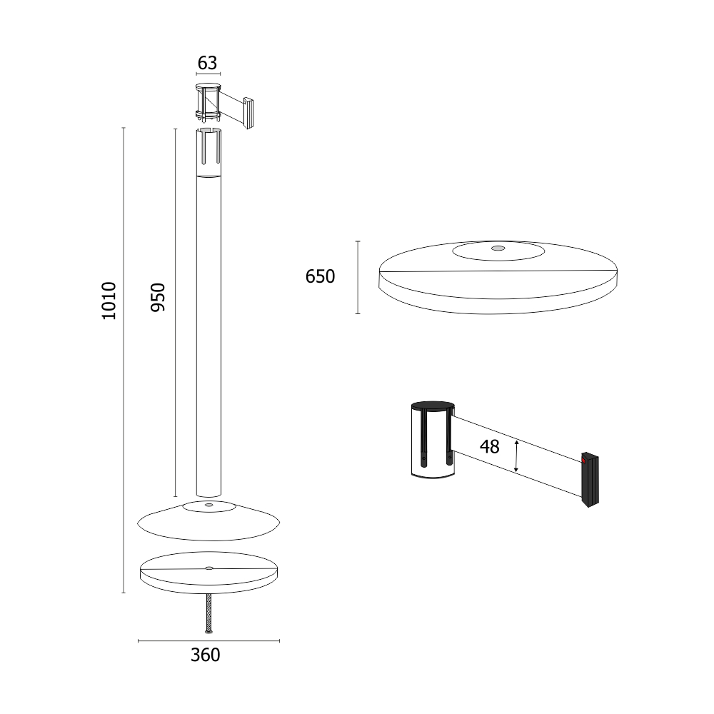 - Base con copertura in acciaio Ø 36 cm, montante Ø 6,3 cm, H colonnina 100 cm.