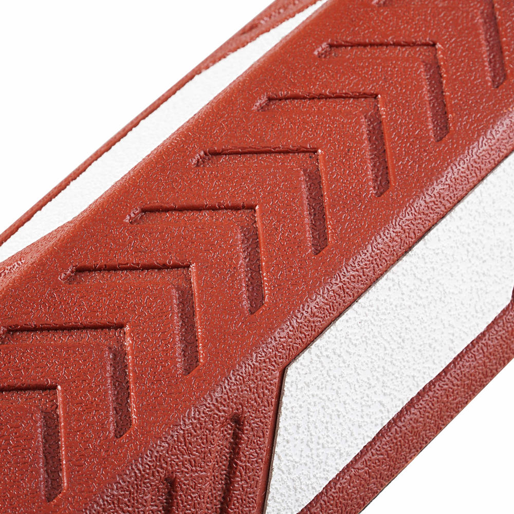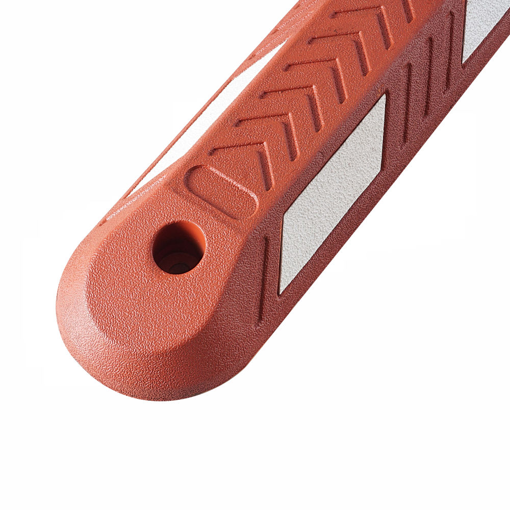 Il ferma ruota in gomma è disponibile nella colorazione nera con bande rifrangenti bianche e nella colorazione rossa con bande rifrangenti bianche.