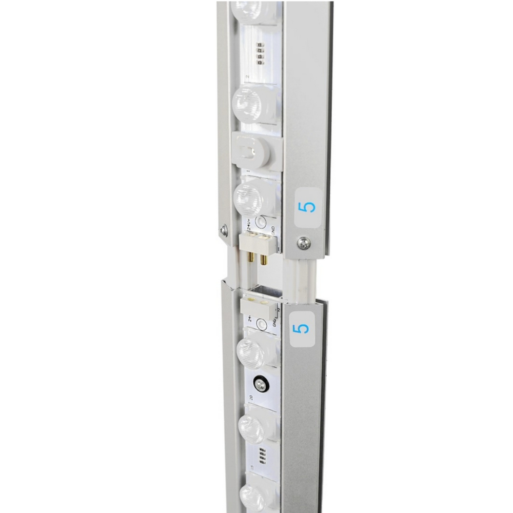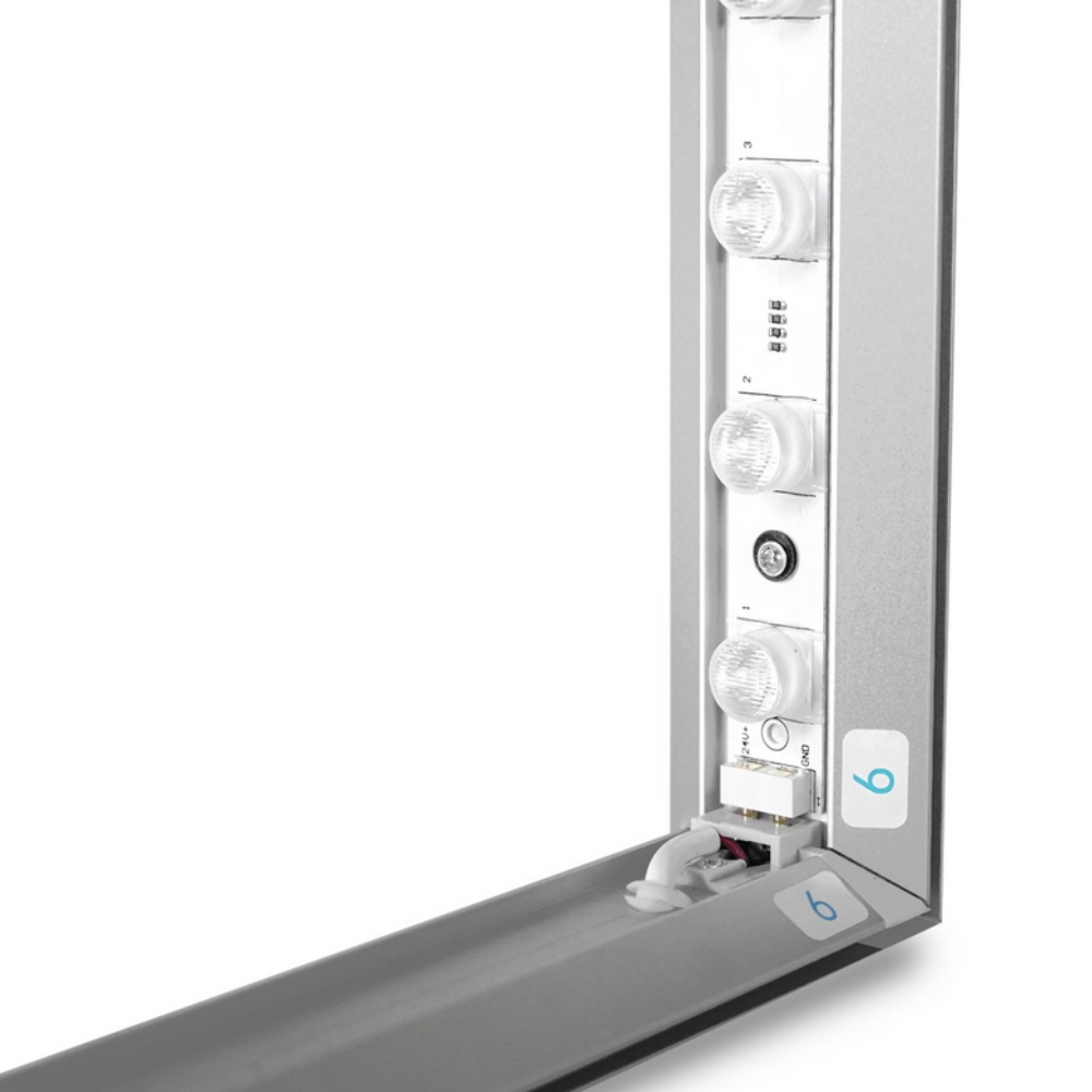 Il montaggio del Lightbox Slim è semplice e intuitivo, non richiedendo alcun utensile. Gli elementi della cornice sono contrassegnati in modo chiaro e dotati di connettori speciali, permettendo di assemblare la struttura in pochi minuti. Una volta completato il montaggio, le stampe possono essere facilmente inserite nella cornice; il materiale tessile è bordato con una striscia in silicone, progettata per inserirsi nella fessura dell’alluminio, assicurando una tenuta perfetta.