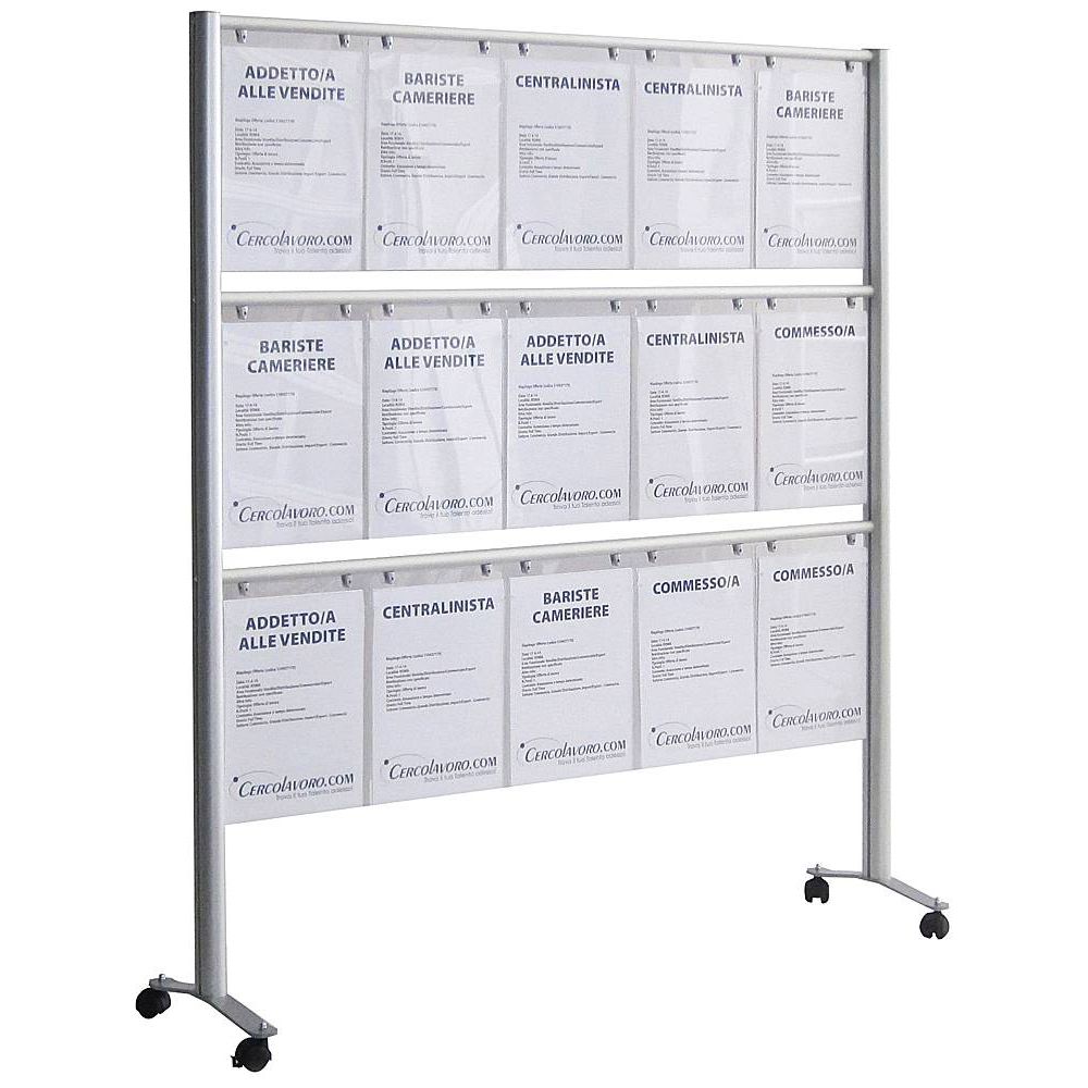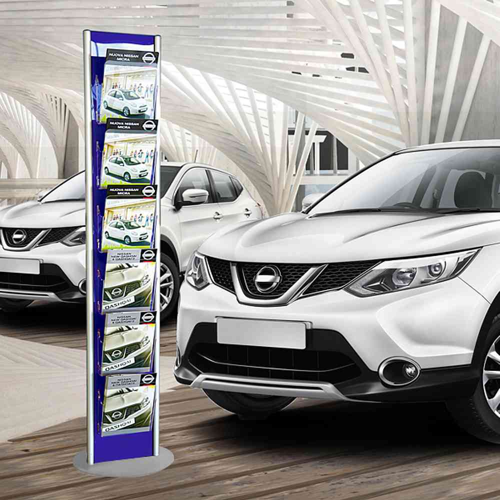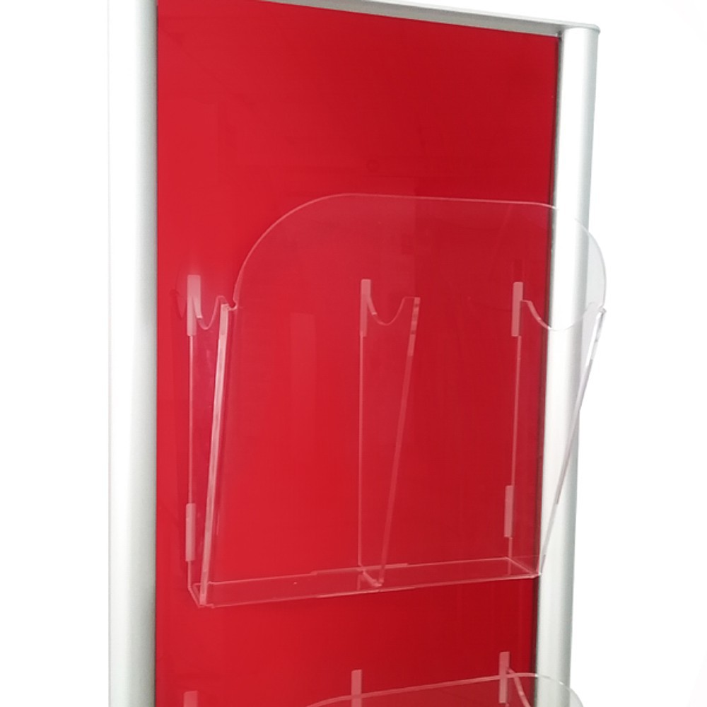 Espositore da pavimento colorato con 6 tasche in plexy trasparente formato A4 con divisorio. Disponibile in 8 differenti colorazioni.