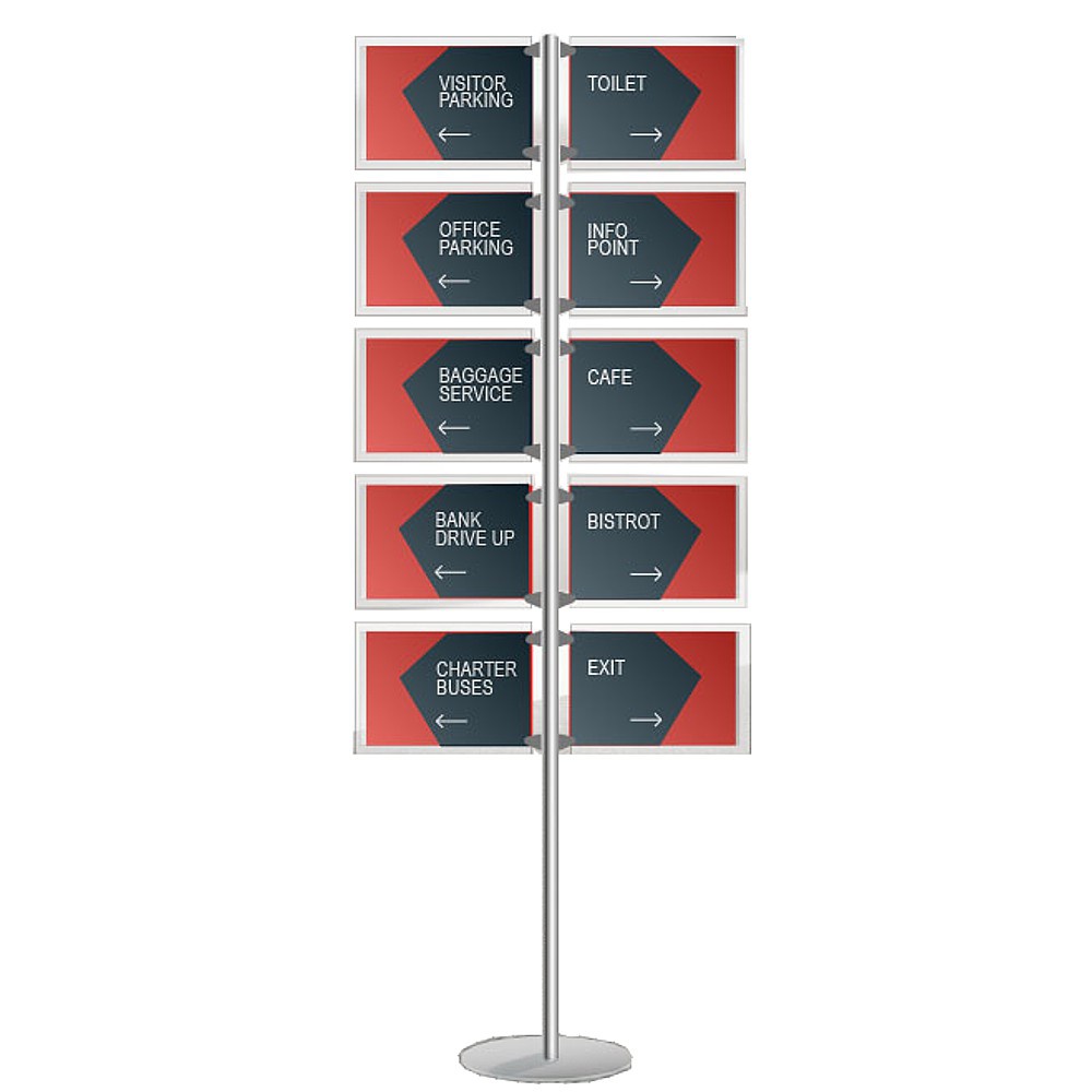 6 tasche in plexiglass trasparente formato A4 con inserto removibile per poter contenere due file di depliant formato 1/3 di A4.