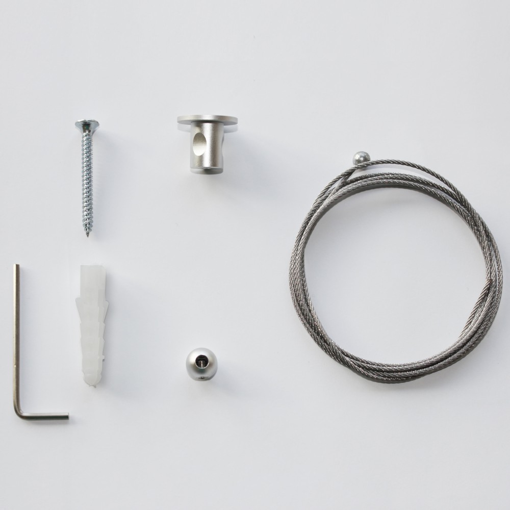 Il prezzo si riferisce ad una coppia di attacchi a soffitto completi di cavo in acciaio di 2 metri, 2 sfere per il bloccaggio, 2 viti e tasselli per il fissaggio a soffitto e 2 brugole per fissare il cavo.