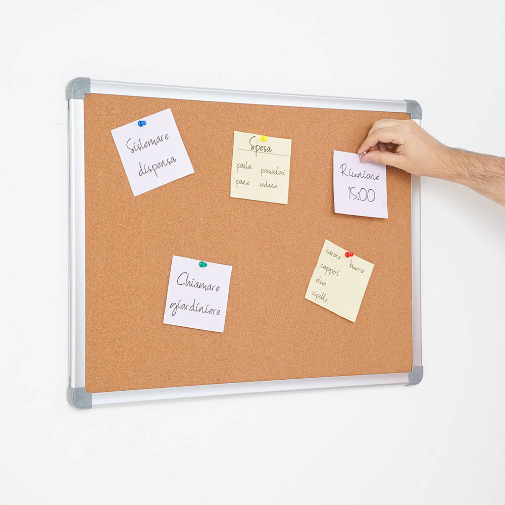 Lavagna in sughero naturale da utilizzare con puntine ferma fogli, disponibile in varie dimensioni e posizionabile in orizzontale o verticale.
