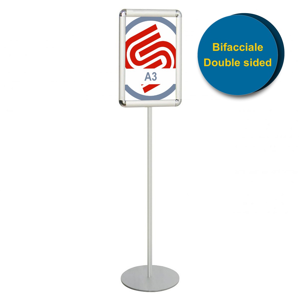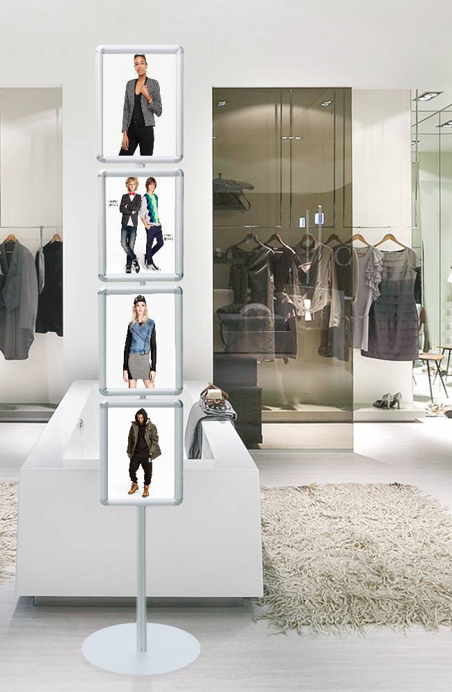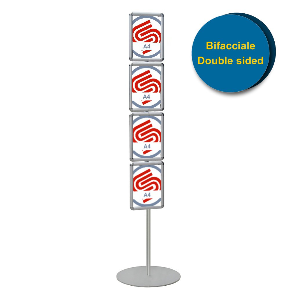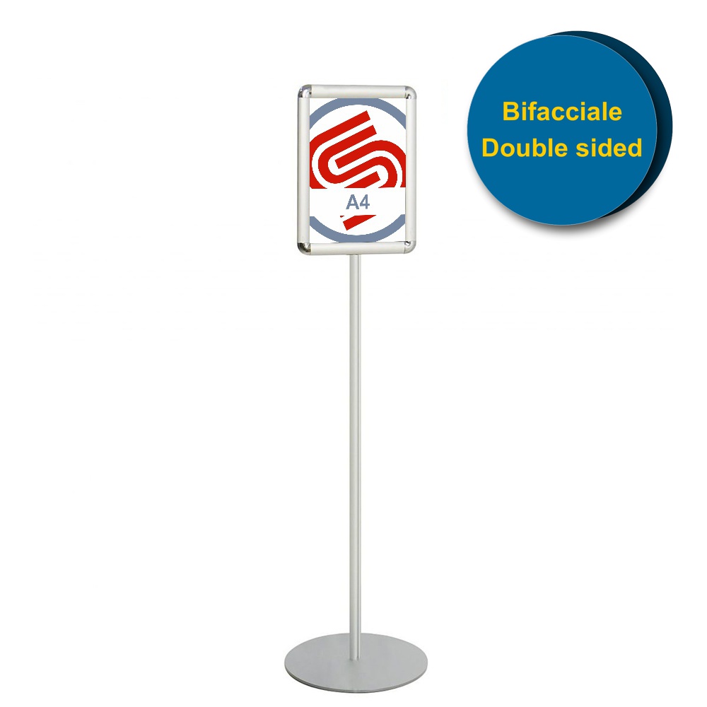 Il leggio con cornice a scatto A4 orientabile è una struttura da terra che fa parte della linea SERIE QUADRA. Si compone di una base in metallo verniciata a polveri color silver, un montante in alluminio a sezione quadra (da cui deriva il nome della serie) ad una cornice per contenere poster formato A4. La cornice è completamente orientabile a 360° senza l’utilizzo di chiavi o attrezzi.