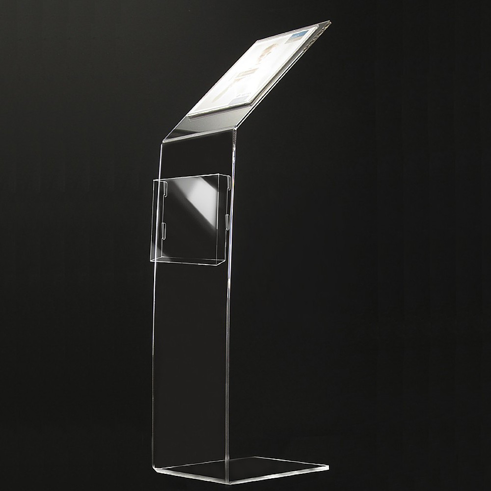 Espositore a leggio in plexiglass trasparente munito di una tasca porta avvisi e una vaschetta portadepliant formato A4.