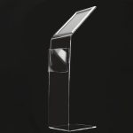 Leggio da pavimento in plexy con base a L e una cornice a scatto formato A4