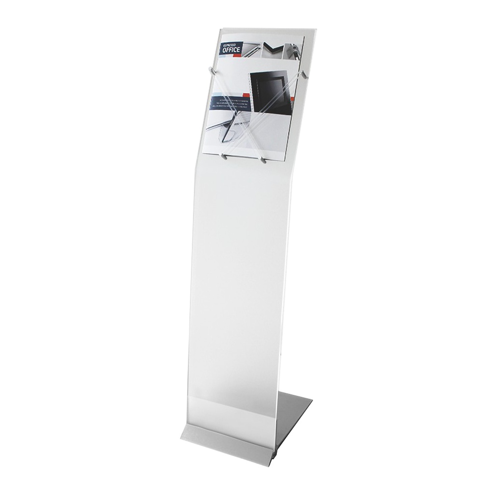 Espositore a leggio portamessaggi da pavimento con elegante struttura in acrilico e alluminio. Disponibile nella versione solo struttura, con tasca porta-messaggio A4 o con supporti in alluminio e anelli in silicone porta-leaflet A4