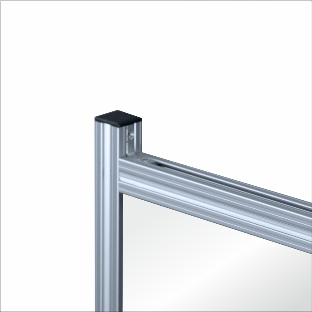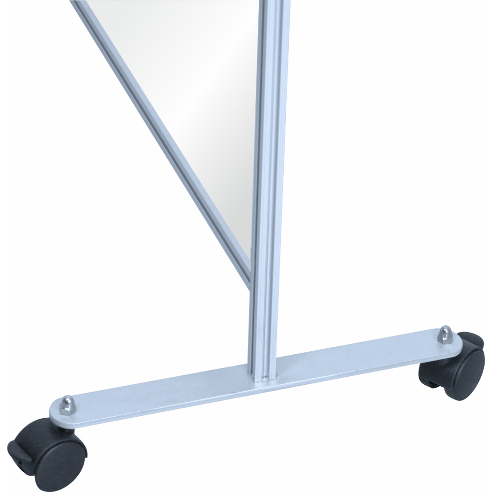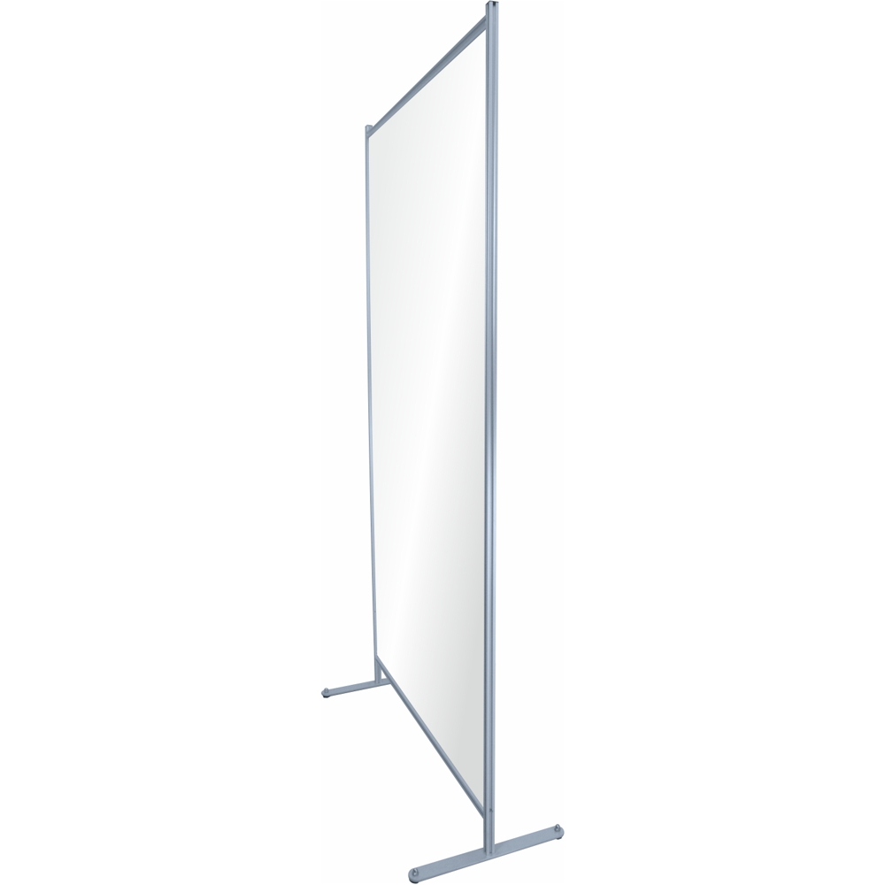 La parete divisoria singola è una struttura da terra che fa parte della linea SERIE QUADRA e si compone di una struttura in alluminio anodizzato silver a sezione quadra da mm. 20×20 (da cui deriva il nome della serie), un pannello in forex o policarbonato alveolare e una coppi di basi che possono essere con piedini fissi o con rotelle per facilitane lo spostamento.