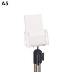 Porta depliant in styrene trasparente a 3 tasche A5 completo di supporto in ABS nero per fissaggio su colonnina segnapercorso tendinastro.