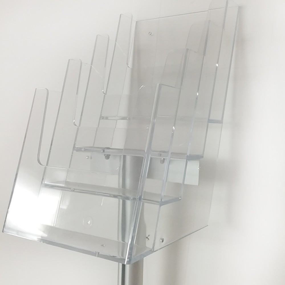Espositore porta depliant da pavimento con base in metallo e 4 tasche trasparenti per cataloghi A5. Disponibile in due versioni