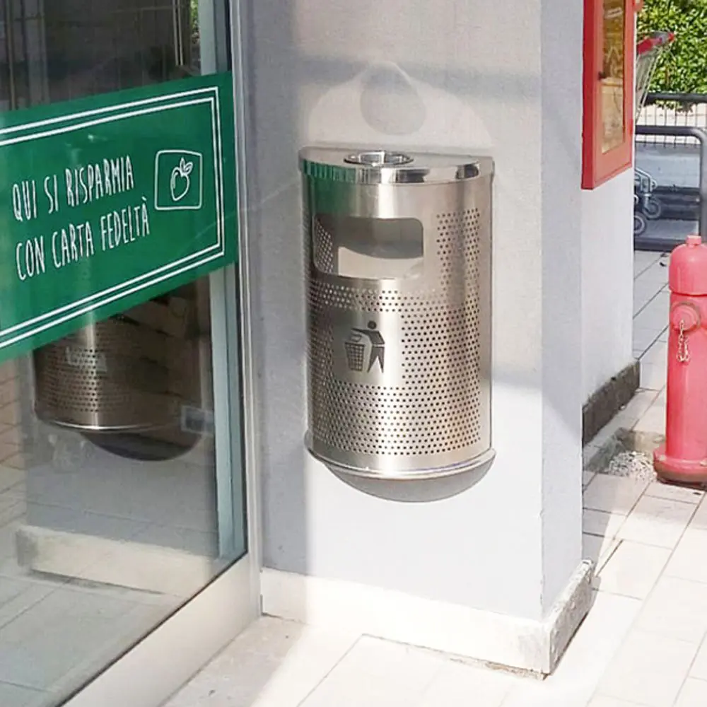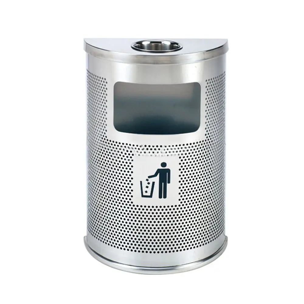 Cestino posacenere da parete interamente in acciaio microforato semicircolare.