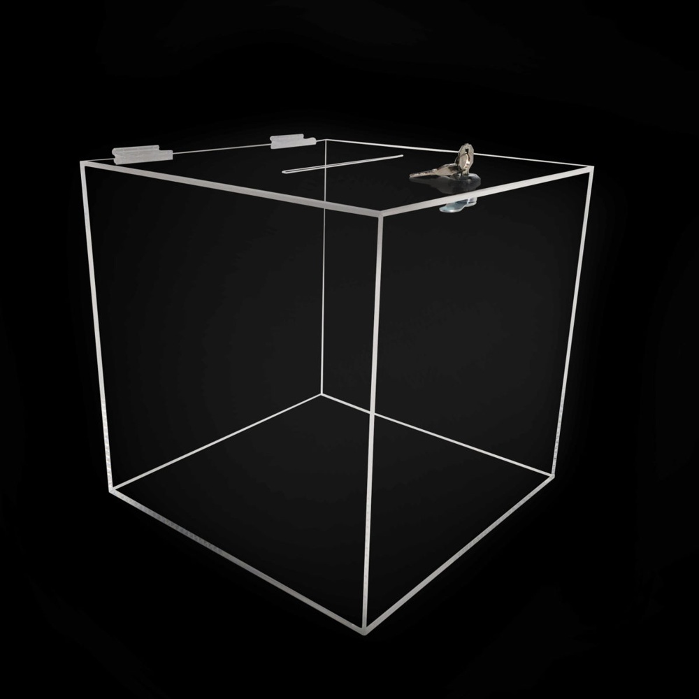 Cubo in plexiglass trasparente con feritoia e apertura con chiave.